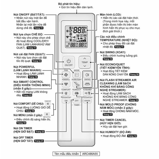· SMART CONTROL (Nhấn giữ 5 giây): Dùng để cài đặt kết nối WiFi. Sau khi kết nối có thể điều khiển bằng điện thoại thông minh.