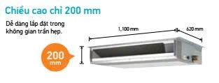 Thiết kế dàn lạnh dạng mỏng, chiều cao chỉ 200mm, phù hợp cho không gian trần hẹp như Căn hộ chung cư, phòng khách sạn, nhà nghỉ cao cấp